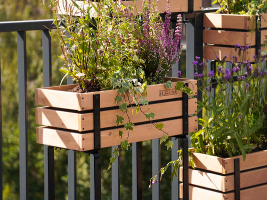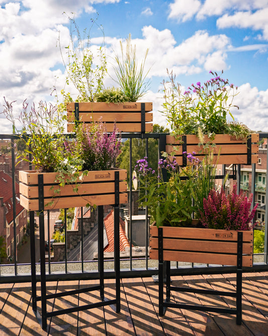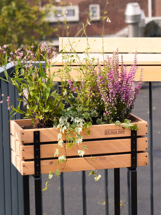 With the Balkonbak you are able to turn your balcony into a green oasis, a place to relax with flowers or the best spot to raise your spices or veggies. The Balkonbak is a handy package, consisting of 12 wooden bars, a bracket set and mounting material. We developed different Balkonbak types in order to provide you with a plantbox in any possible spot of your balcony.