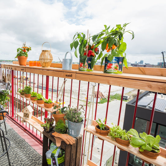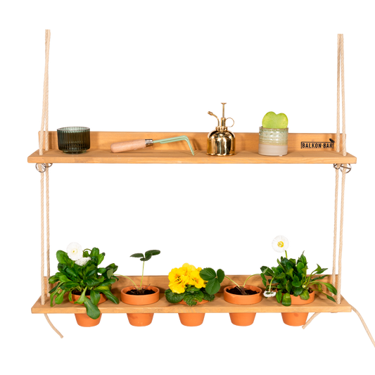 The must-have for all plant lovers: the Balkonbar Hanging Garden! The Balkonbar Hanging Garden can be attached to the bottom of your Balkonbar, a wall or even at your stair gate and contains 5 round holes with a diameter of 10 cm in which you can place pots. Ideal for creating a mini vegetable garden with plants, herbs and cheerful flowers.