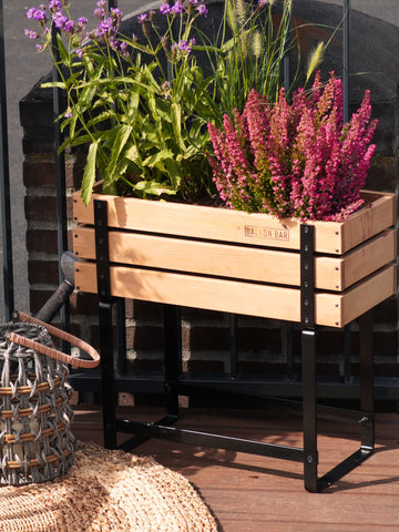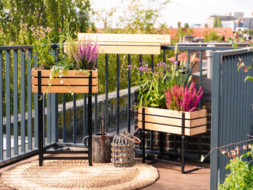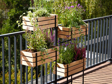 With the Balkonbak you are able to turn your balcony into a green oasis, a place to relax with flowers or the best spot to raise your spices or veggies. The Balkonbak is a handy package, consisting of 12 wooden bars, a bracket set and mounting material. We developed different Balkonbak types in order to provide you with a plantbox in any possible spot of your balcony.
